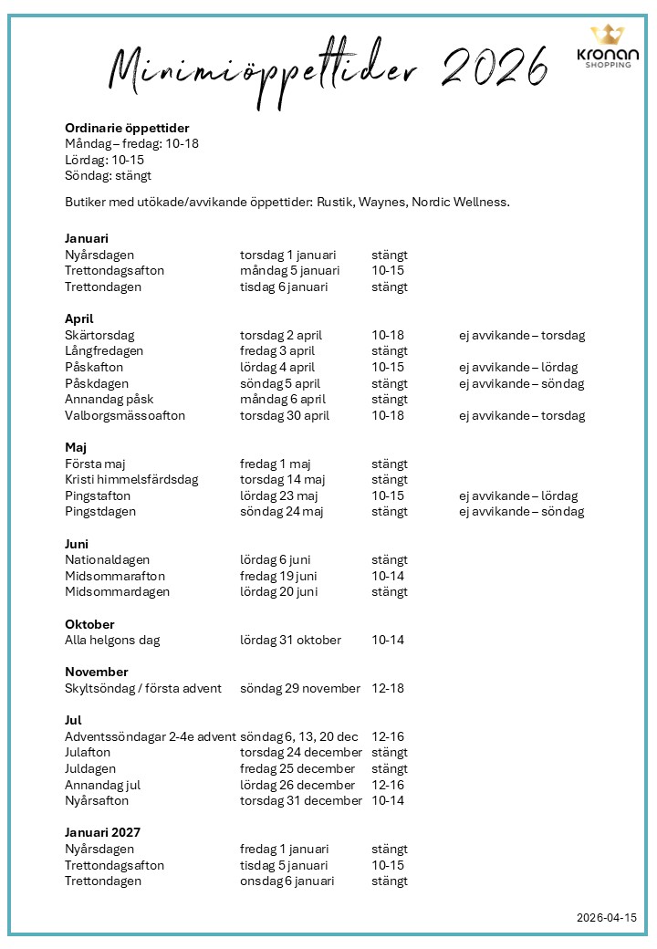 Kronan Shopping är en del av Point Properties som arbetar för att skapa och förvalta levande stadskärnor. En levande stadskärna är en trygg mötesplats för alla. Här hittar du snabbt och enkelt hittar det du behöver när du behöver det.
